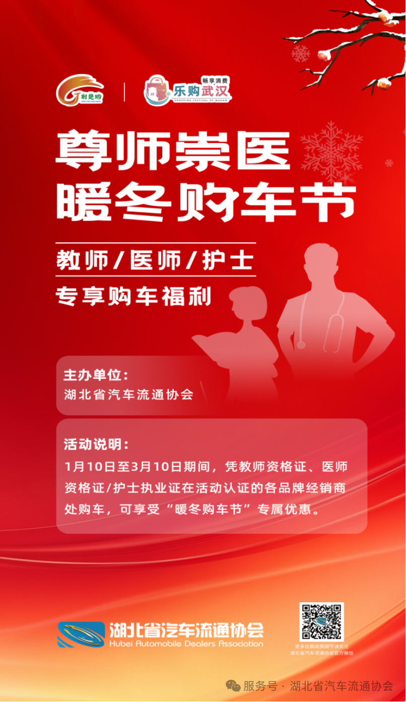 岁末年初之际,在积极响应商务部关于推动消费品更新迭代、推进服务消费品质升级的国家战略框架下,湖北省汽车流通协会遵循省、市两级政府关于提振内需、激励汽车消费的宏观指导方针,抢抓加力扩围推进消费品以旧换新有利契机,在湖北省商务厅与武汉市商务局的指导与支持下,于2025年寒假及“双节”期间策划开展了面向教育和医疗系统的迎春促销公益活动——“尊师崇医暖冬购车节”。充分发挥节庆活动和政策红利叠加效应,以更好的汽车产品、更优惠的价格、更好的服务体验活跃拓展市场,服务教师和医护人员,激发汽车消费市场活力。湖北省汽车流通协会积极发挥动员协调作用,组织各汽车厂商、经销商提供面向教师和医护人员的专属优惠政策。包括埃安、比亚迪、方程豹、智己、红旗、上汽大众、五菱汽车、长城哈弗等多家知名品牌推选的优质经销商参与其中。本次活动入选经销商均是经过厂商认证的授权经销商,并对本次活动所提供的优惠政策和优质服务出具了书面承诺函,最终经湖北省汽车流通协会和相关部门形式审核通过后入选。各品牌促销政策形式多样、实惠满满,力图通过诚意优惠和优质服务,给教师和医护人员送去专属购车礼遇,让大家在购车和服务中切实体会到真实惠和真关爱。“尊师崇医暖冬购车节”活动时间为1-3月。活动期间,湖北省汽车流通协会将联合各大媒体,采取多种形式积极宣传参与汽车品牌和产品的优惠信息,同时在武汉三镇热门站点的地铁灯箱上公布参与活动的经销商名单,持续扩大宣传效果,使更多目标群体知道此次“尊师崇医暖冬购车节”带来的专属优惠。